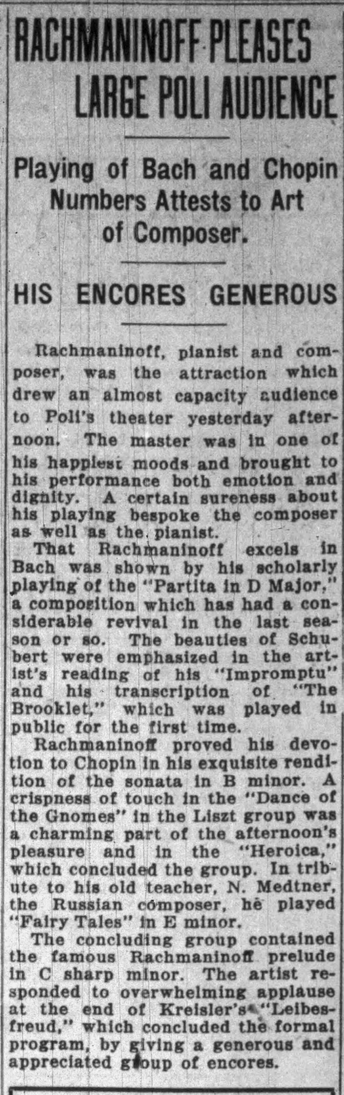 Martyn (p. 434) indicates that the Schubert Impromptu was D. 899, no. 4. Tchaikovsky's Troika and Rubinstein's transcription of the Turkish March from Beethoven's Ruins of Athens are noted as the encores in the attached reviews. LoC, Sergei Rachmaninoff Archive, ML31.R33, Papers of Sophie Satin, boxes 82-89.
