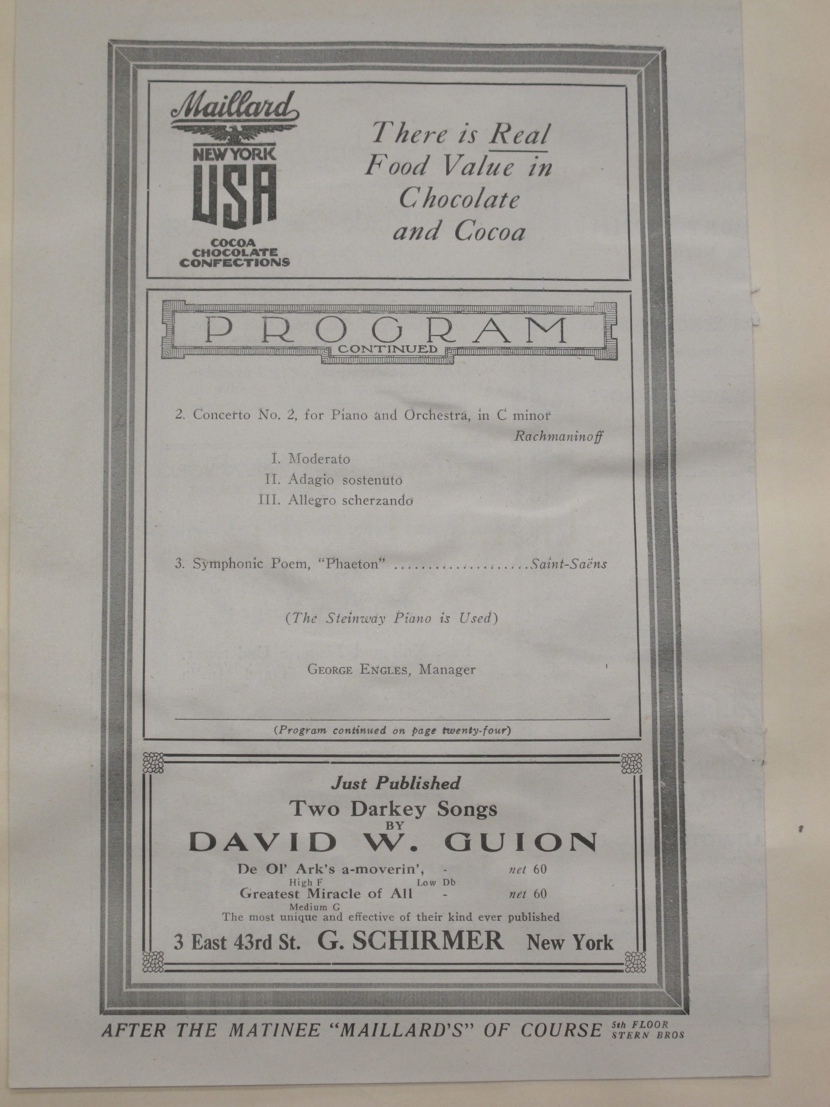 Satina indicates that this was Rachmaninoff’s first appearance this season with an orchestra. The concert began at 3pm. The first attached review indicates that Rachmaninoff's Third Piano Concerto was to have been performed, but the parts were 'at sea' and the Second Concerto programmed in its place. LoC, Sergei Rachmaninoff Archive, ML31.R33, Papers of Sophie Satin, boxes 82-89.